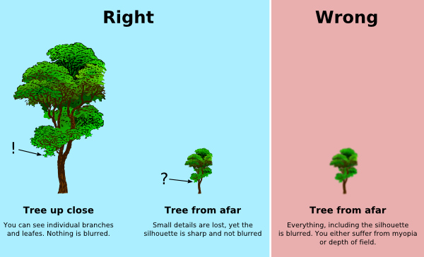 When you look at a tree that is close to you, you can see each individual leaf and even the smallest branches. The farther you walk away, the more details get lost. You cannot make out the leaves but only see a greenish structure. But: The silhouette of the tree itself is still sharp. It does not get blurry.