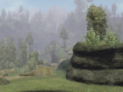 But even without a 3D display, there is no real lens in a computer game and thus, none of the limitation of such an optical device apply. The game can theoretically render everything sharp, near objects as well as far objects. And that would simulate real life. Of course, the lens in your eye cannot focus on everything at once. Look at your monitor and the wall behind it becomes blurry. Look at the wall and the monitor is blurry. But: Whatever you really look at is sharp. And that's the effect we have when ban DoF from computer games. You can look at the trees in the background and they're sharp. You can look at the barrel in the foreground and it's sharp.
